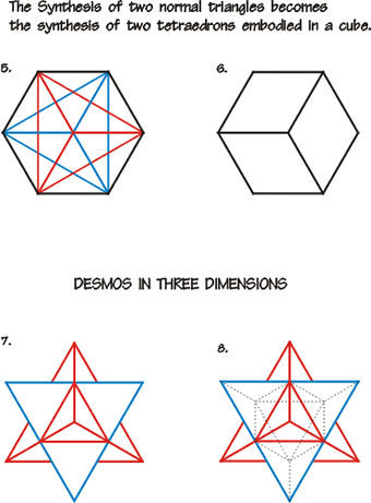 The eight vertices of the synthesis coincide with the vertices of a cube. The edges of the two tetrahedrons are diagonals of the cube’s six faces. Through this approach the cube can be considered to contain the synthesis of the two tetrahedrons like a framework (or an analysis).