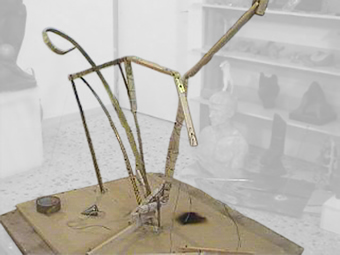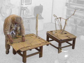 Ο σκελετός (κατασκευή με σίδηρο και ξύλο), πάνω στον οποίο κτίζεται το έργο. Ο σκελετός έχει το σχήμα της αφηρημένης έννοιας, αλλά στις τρεις διαστάσεις πλέον, πράγμα που επηρεάζει ανάλογα το γενικό σχεδιασμό του έργου. Ενίσχυση της φόρμας του σκελετού με γύψο και τζίβα, έτσι ώστε να συγκρατεί και να καθοδηγεί τη μάζα της πλαστελίνης, που πρόκειται να προστεθεί. |